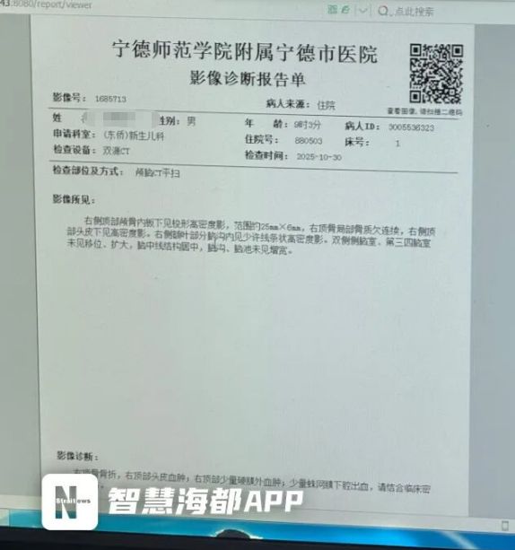 诊断报告显示,孩子右顶骨骨折、右顶部头皮血肿;右顶部少量硬膜外血肿;少量蛛网膜下腔出血。院方还给孩子下了病重通知单。